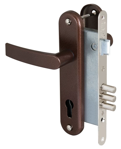 Замок врезной цилиндровый ЗВ4-3/СП11.РФ58-002.Ш2 с защелкой и фалевыми ручками предназначен для входных и внутренних дверей толщиной 40-50 мм жилых домов, квартир, торговых и конторских помещений. Замок универсальный, его можно устанавливать как в правые, так и в левые двери, переустановив защелку. Межосевое расстояние 85 мм. Дверь может быть закрыта на защелку и открыта с помощью фалевой ручки при открытом засове замка. В комплекте: накладки с фалевыми ручками «медный антик». Изготавливается с засовом из трех стальных стержней круглого сечения. Покрытие корпуса — цинковое. Покрытие лицевой и ответной планок — никелевое. Вылет ригелей — 22 мм, диаметр ригеля — 10,7 мм. Бэксет - 52,2 мм.